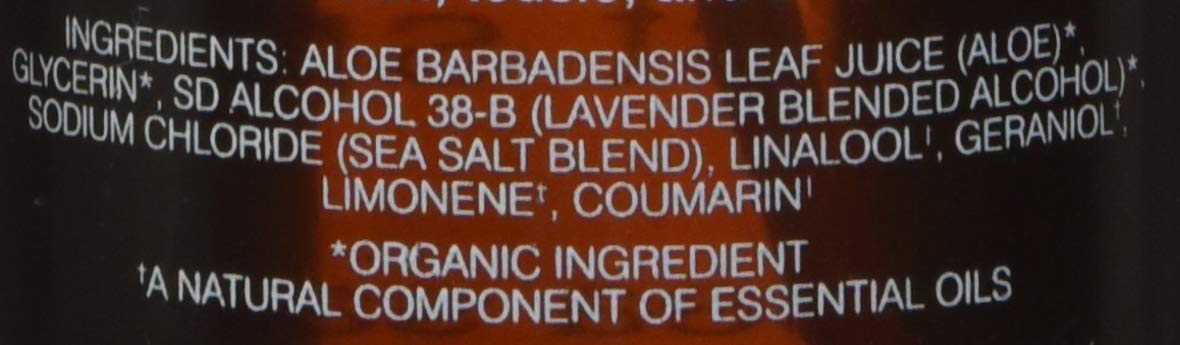 Simply mist hair and give it a shake and scrunch as real sea salt adds body and enhances texture while lavender oil protects hair from drying out and leaves behind a calming scent. Simply mist hair and give it a shake and scrunch as real sea salt adds body and enhances texture while lavender oil protects hair from drying out and leaves behind a calming scent. Aloe Barbadensis Leaf Juice Aloe Glycerin SD Alcohol 38-B Lavender Blended Alcohol Sodium Chloride Sea Salt Blend Linalool Geraniol Limonene Coumarin Organic ingredient A natural component of essential oils.