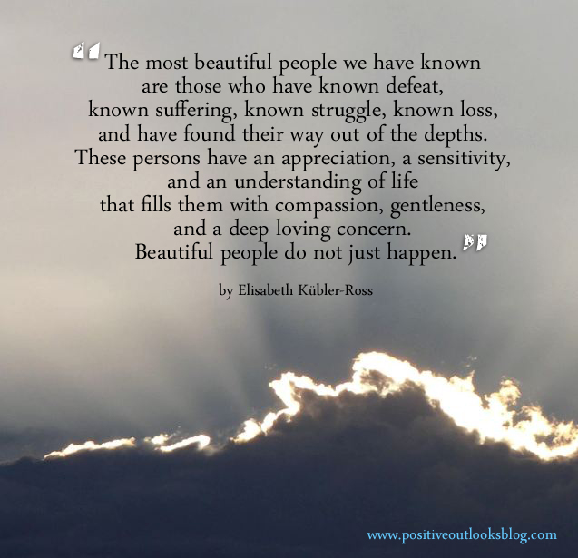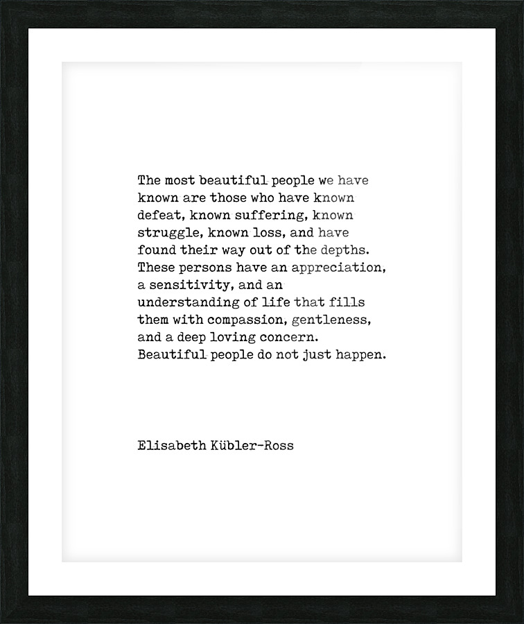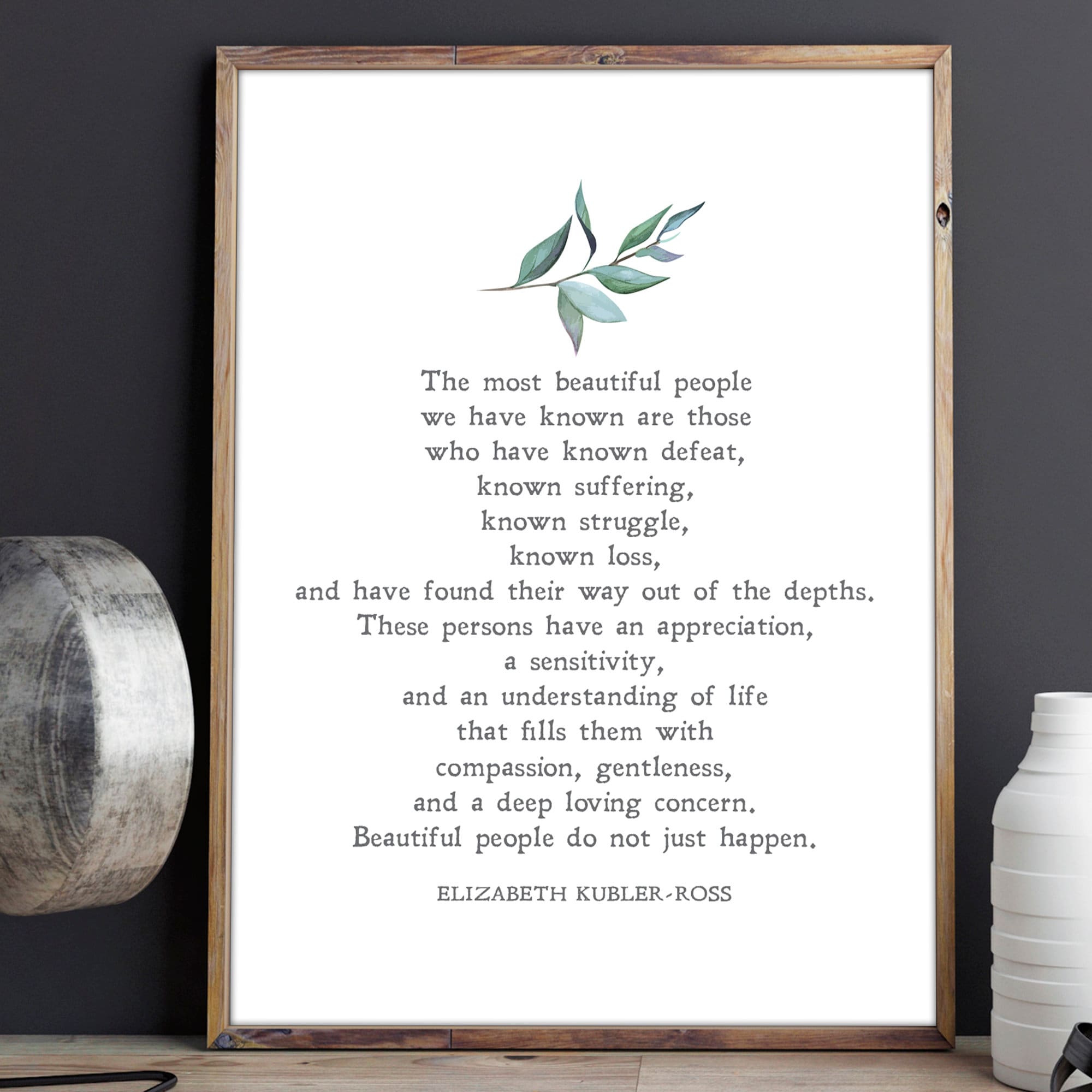 Elisabeth Kubler-Ross The most beautiful people we have known are those who have known defeat known suffering known struggle known loss and have found their way out of the depths. The most beautiful people we have known are those who have known defeat known suffering known struggle known loss and have found their way out of the depths. Beautiful people do not just happen. These persons have an appreciation a sensitivity and an understanding of life that fills them with compassion gentleness and a deep loving concern. These persons have an appreciation a sensitivity and an understanding of life that fills them with compassion gentleness and a deep loving concern. Most beautiful beautiful struggle way. A black and white high quality art print featuring an wonderfully inspiring quote from Elisabeth Kubler-Ross. Beautiful Elisabeth Kubler Ross Quotes On Not Giving Up. These persons have an appreciation a sensitivity and an understanding of life that fills them with compassion gentleness and a deep loving concern.